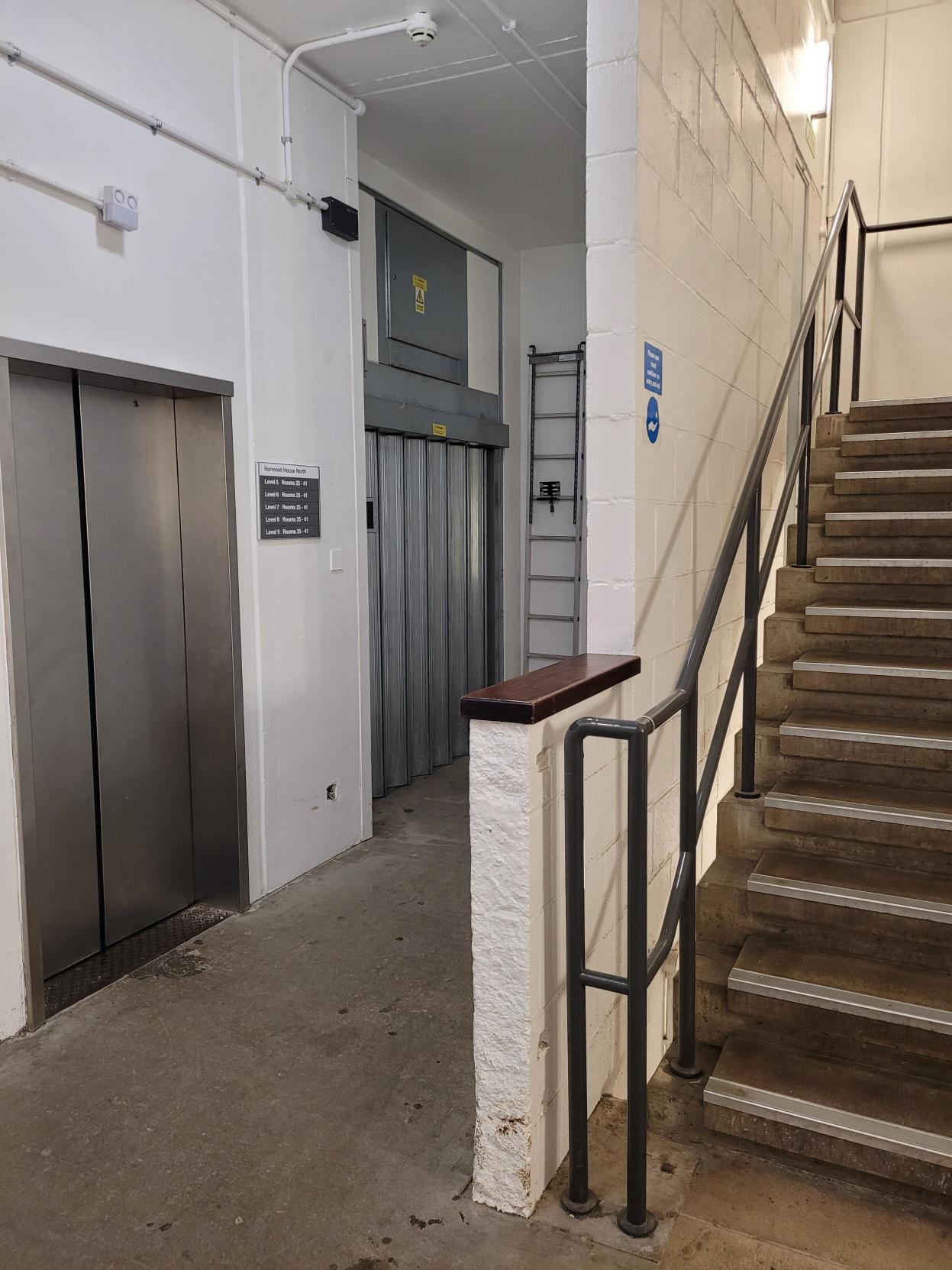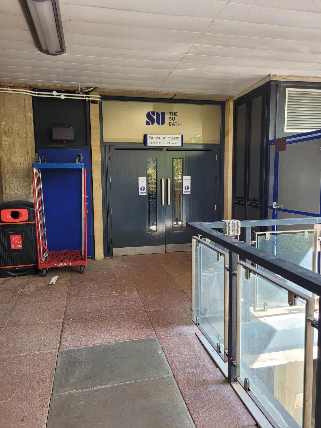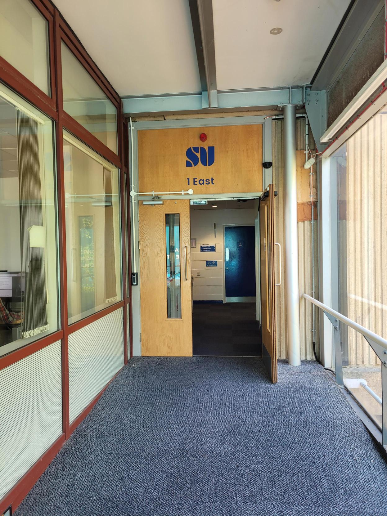 Using the Norwood House lift. Enter The SU by the side entrance (photo 1 below), turn left into Norwood House (2) and take the lift to Level 3 (3). Turn left in the stairwell, go through the double doors into 1 East, take the double doors to your left (4) and go along the corridor (5). You'll find us on your left hand-side by the printer.