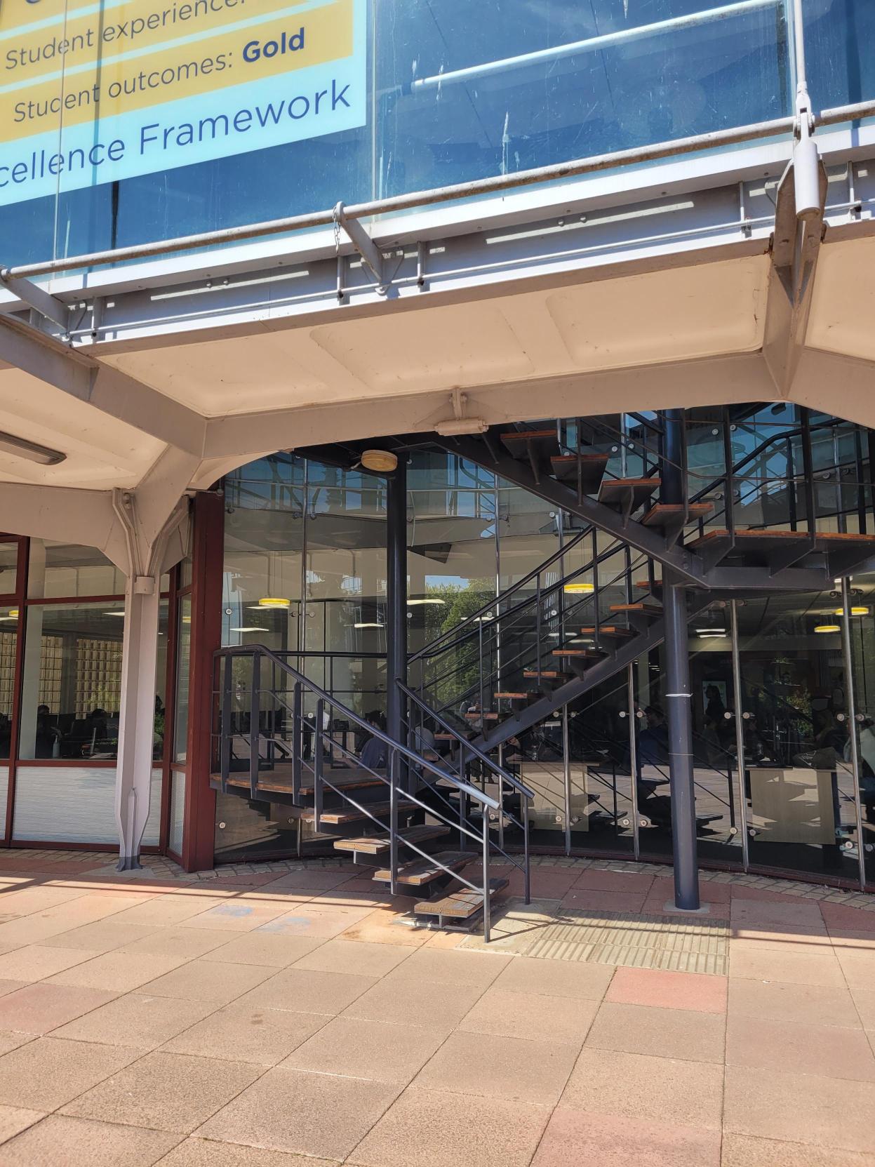 Coming up the staircase outside the library (photo 1 below), turn left and walk along the corridor (2), go through the double doors (3), turn right and you'll see our poster at the end of the corridor infront of you (4).