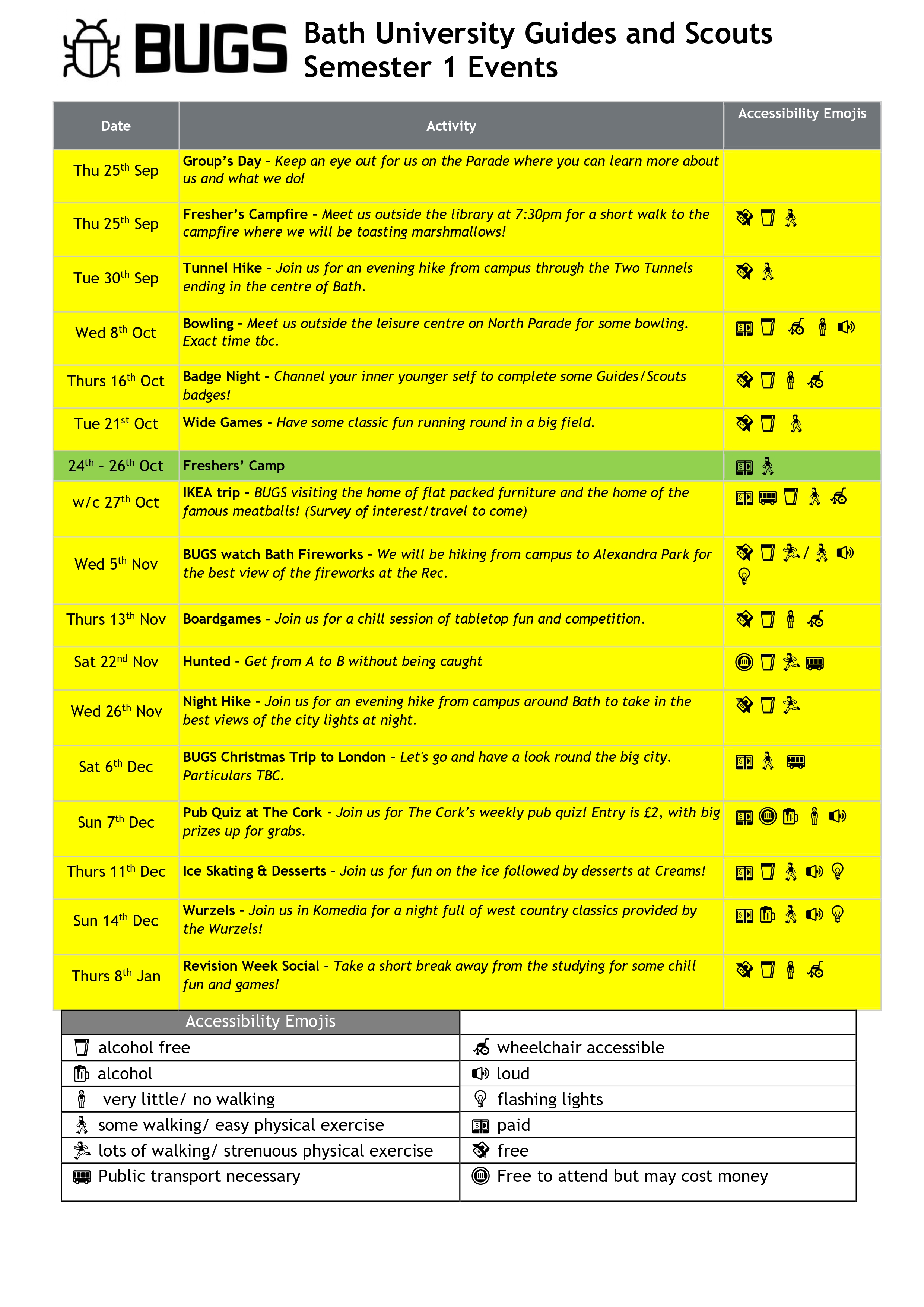 Bath University Guides and Scouts (BUGS) take part in a range of activities every year from boating and crafts, to pub tours and campfires. Affiliated with the Student Scout and Guide Organisation.