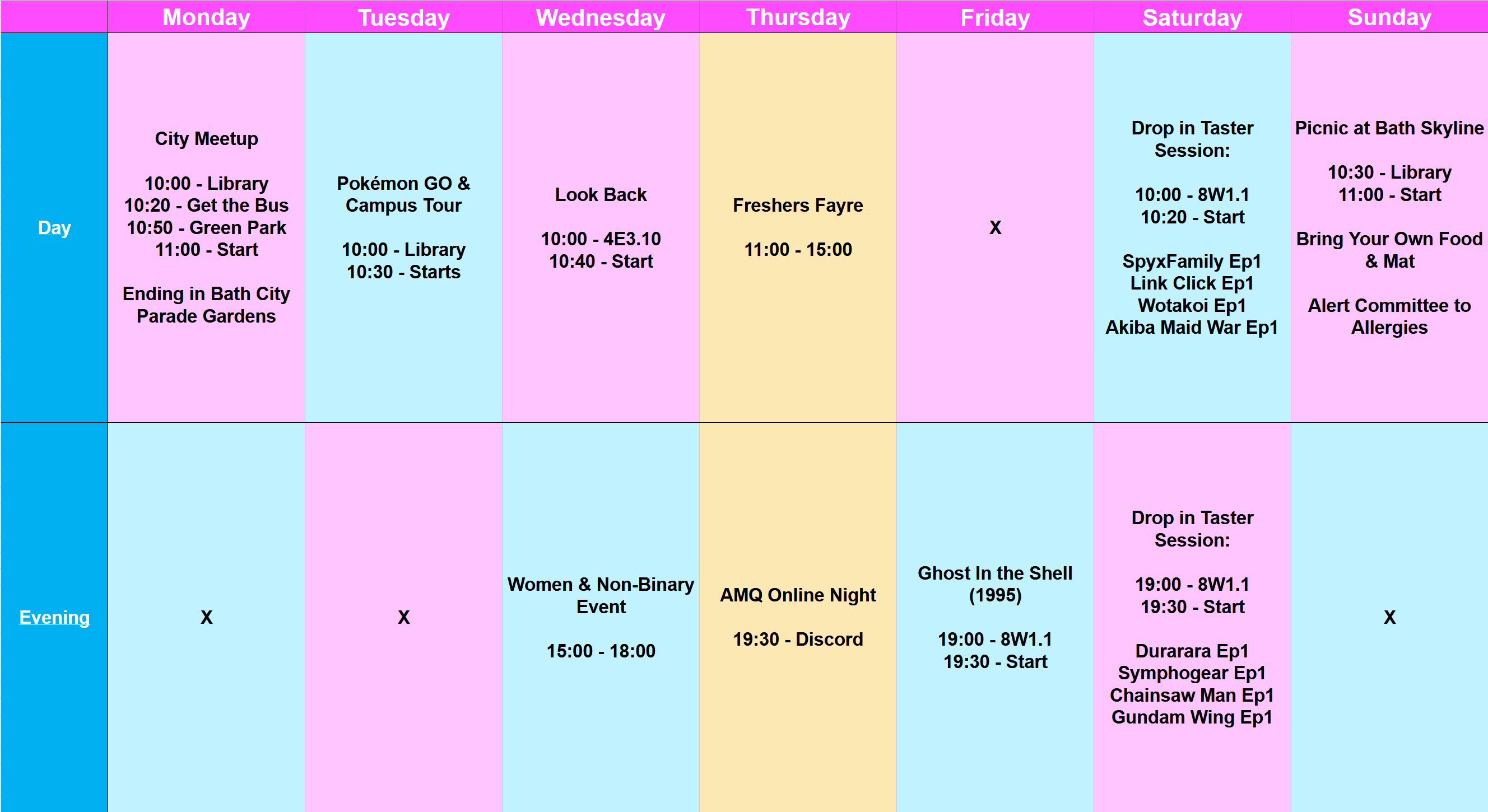 We will be doing some events for Freshers week! Check the timetable below to see when they will be happening and join the Discord server to get in touch and find out more about each of our events!