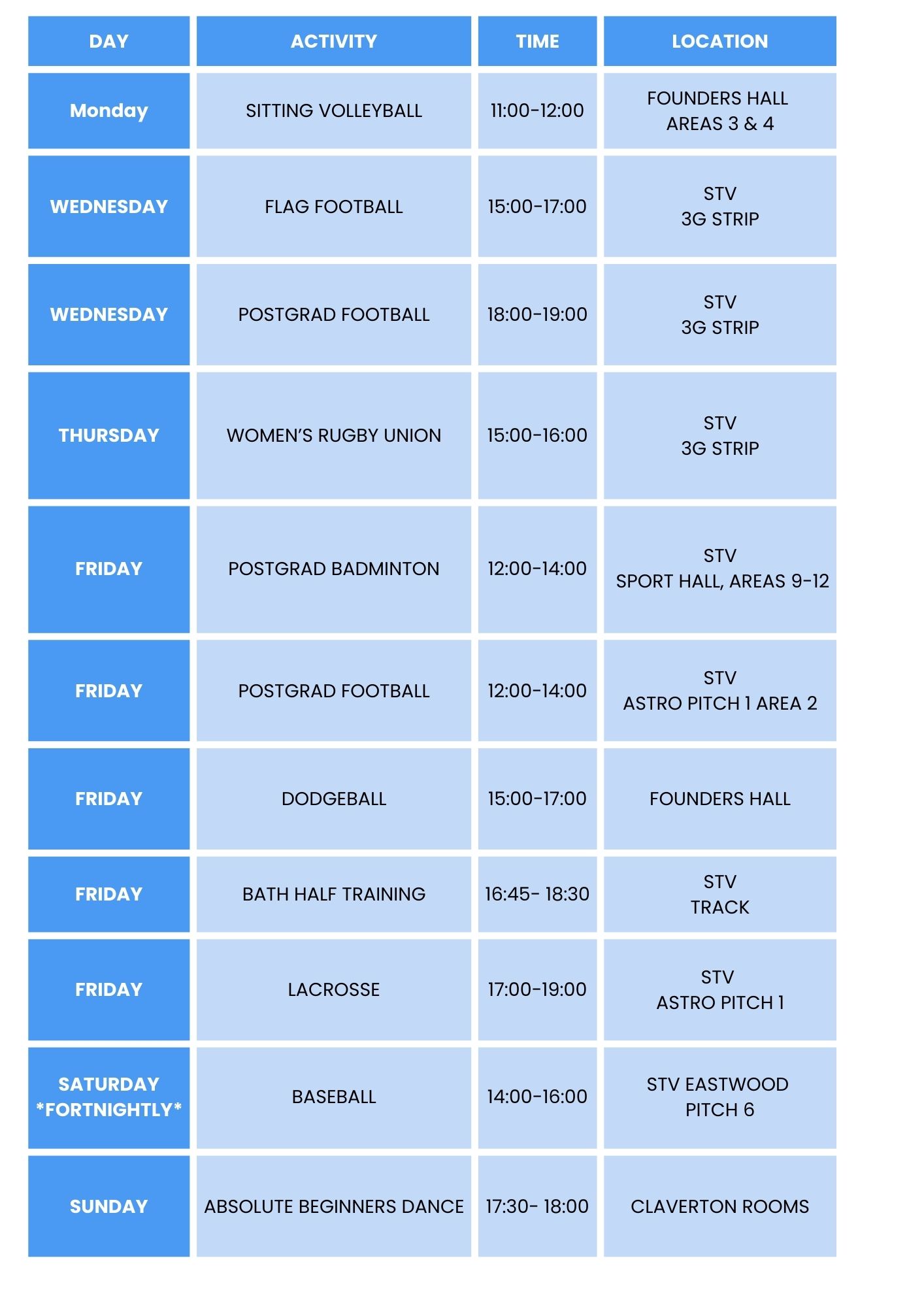We are constantly looking to expand our Bath Active offers, so this timetable will be ever-expanding throughout the year!